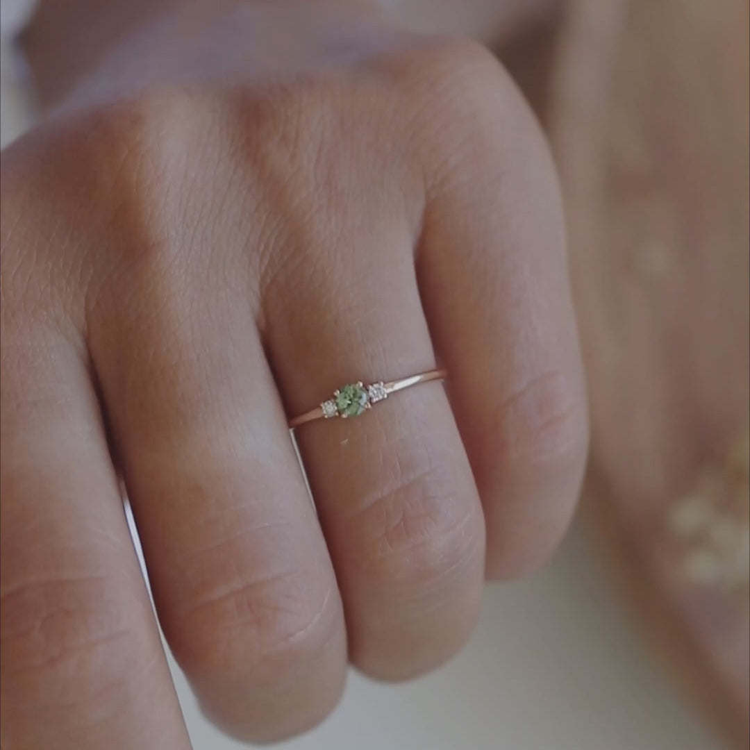 Tento elegantní prsten má kulatý zelený safír jako svůj vrchol doplněný dvěma šumivými diamantovými akcenty. Vyrobeno z 14k pevného zlata, je k dispozici ve žluté, růže nebo bílém zlatě. Jemná skupina přidává nadčasové kouzlo, díky čemuž je ideální pro každodenní nošení nebo zvláštní příležitosti.