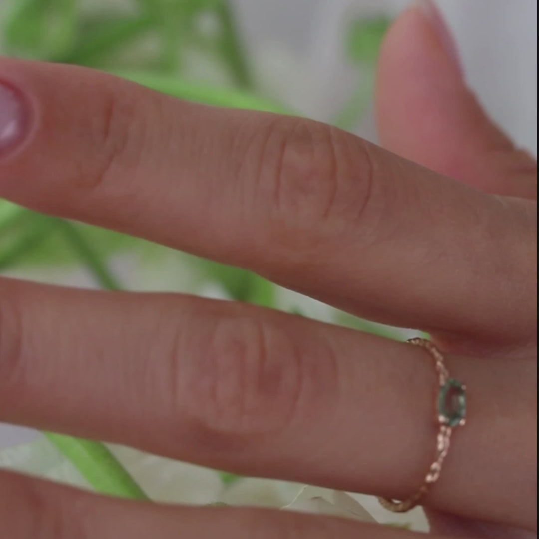 Tento solitaire prsten je osazen oválným zeleným safírem o rozměrech 3 × 5 mm a je precizně vyroben z 14karátového zlato. Štíhlá obroučka o šířce 1,6 mm je dostupná ve žlutém, bílém i růžovém provedení a lze ji zvolit v hladké nebo tepané variantě pro osobitý styl.
