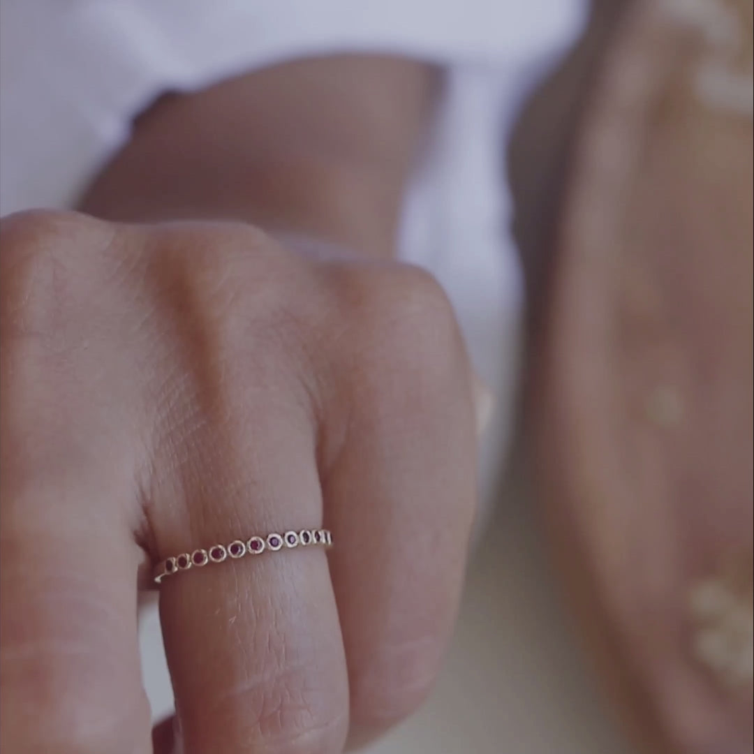 Dieser zarte Stapelring aus 14 karätigem Gold ist mit rund 0,18 Karat Rubinen in einer sicheren Bezel Fassung besetzt, die drei Viertel des Rings schmücken. Die 1,80 mm schmale Schiene sorgt für ein feines, elegantes Profil – ideal zum Stapeln oder solo tragbar. Erhältlich in Gelb, Rosé und Weißgold.