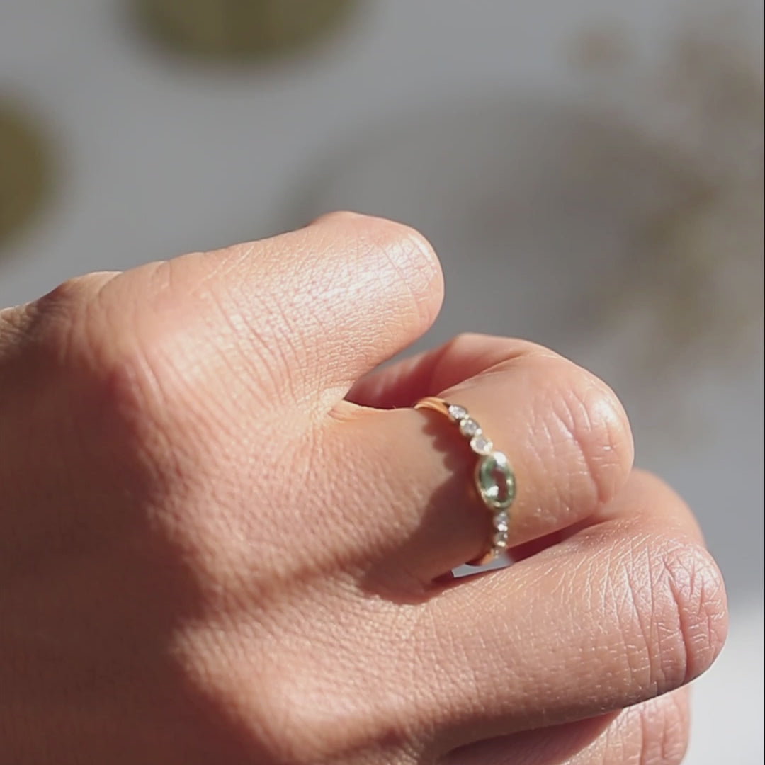 Ein raffinierter Ring, der einen ovalen grünen Saphir mit sechs funkelnden Diamanten in einer sicheren Zargenfassung (Bezel Setting) präsentiert. Zeitlos, modern und perfekt, um ein besonderes Versprechen zu besiegeln.
