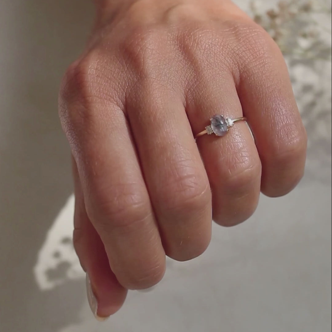 This elegant ring features a 7x5 mm cabochon-cut moss agate as the centerpiece, with its natural patterns adding unique beauty.