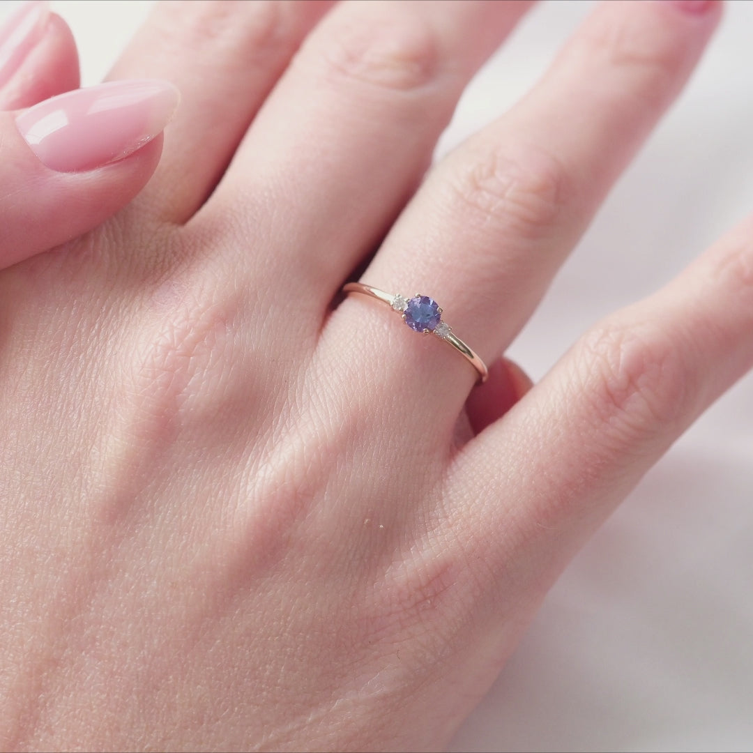 This dainty tanzanite ring features a stunning 0.30 ct tanzanite in the center, flanked by sparkling diamonds. Its slim band adds a touch of elegance to any look.