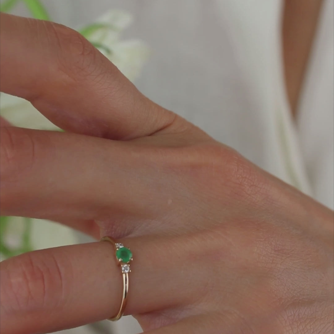 A dainty three-stone ring featuring a central emerald ( 0.25–0.30 ct) flanked by two G–VS2 diamonds totaling 0.04 ct. Crafted in 14K yellow, rose, or white gold with a slim 1.35 mm band, this timeless design combines simplicity and elegance, making it perfect for engagements, anniversaries, or meaningful gifts.