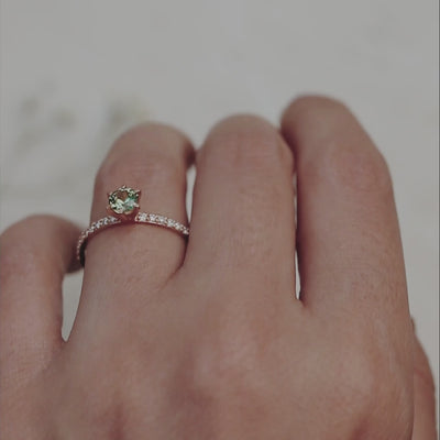 Center stone: 0.45 ct round-cut green sapphire, six-prong setting
