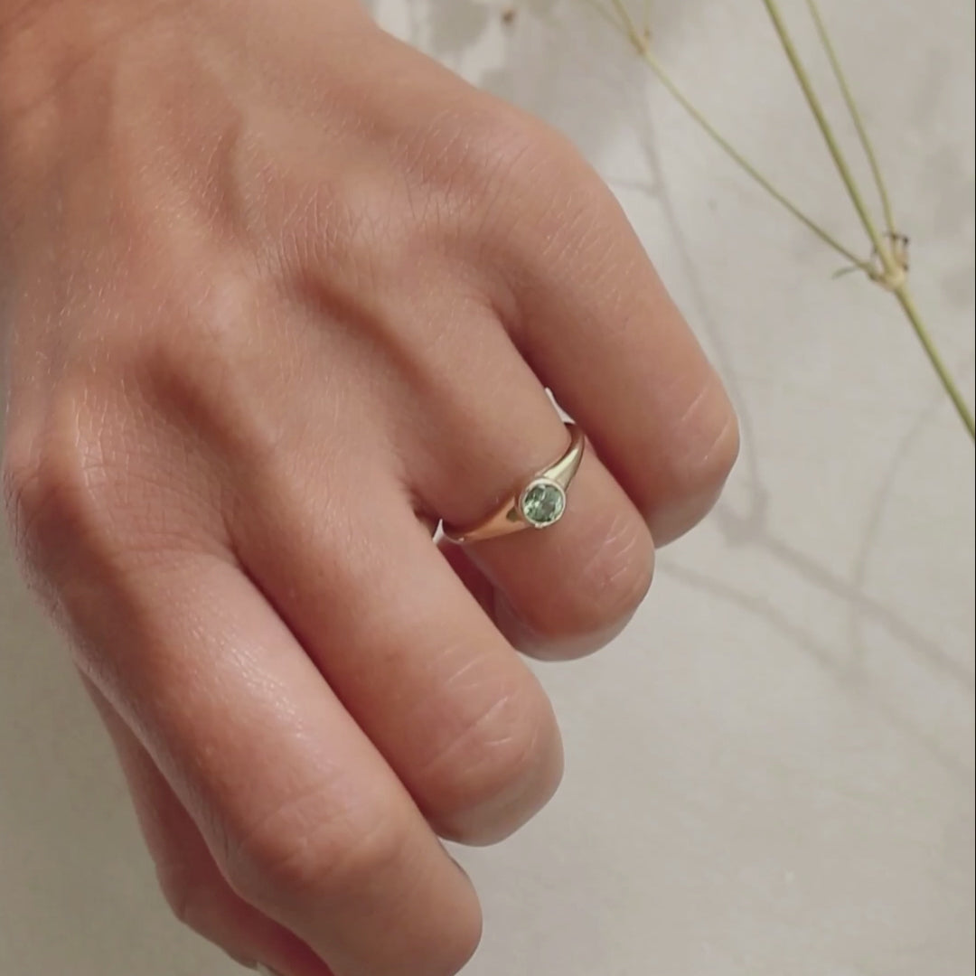 The round green sapphire signet ring is a timeless and meaningful choice for those seeking a unique and elegant engagement ring. Its exquisite design, along with the spiritual and physical attributes associated with the green sapphire, make it a captivating symbol of love and commitment.