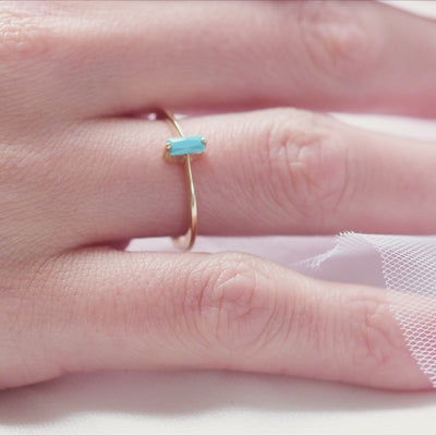 This solitaire ring features a sleek baguette-cut turquoise, set in a minimalist 2-prong setting on a delicate 14k gold band.