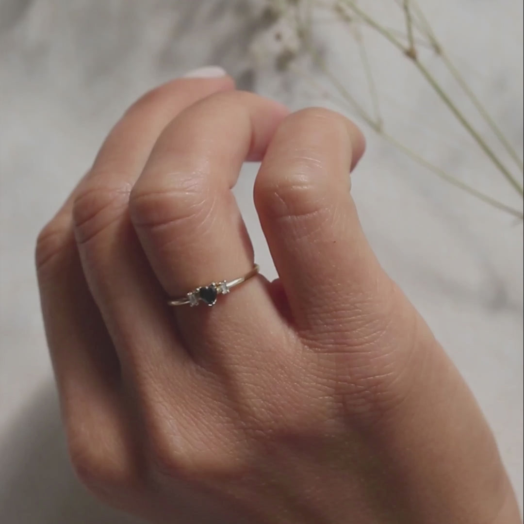 A stunning and dainty heart-shaped black diamond ring, accented with two baguette side stones, perfect for an elegant engagement or a thoughtful gift for any occasion.