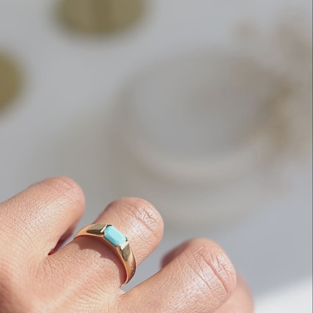 Embrace a touch of vibrant elegance with this stunning Turquoise Signet Ring, meticulously crafted in 14k solid gold. Featuring a 6x4 mm emerald-shaped turquoise stone, this ring is a striking blend of bold color and classic design. The band width starts at 5 mm at the top and tapers gracefully to 2.30 mm at the bottom, ensuring both a stylish appearance and a comfortable fit.